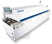Après la machine de TYCO, les PCB’s passe dans ce four pour traitement. Le four fonctionne sur 208V avec 3 phases. Des températures uniformes sont réalisées avec des éléments chauffants et ventilateurs à poids légers et très sensibles qui créent un écoulement turbulent d'air ou d'azote autour des composants. Trois thermocouples surveillent la température pour son profil. N'importe quel genre de flux (par exemple RMA, noclean, etc..) peut être prévu à être employé sur les PCB's. Ce four emploi la filtration de flux de la génération V pour enlever la majeure partie du flux avant qu'il ait une chance de se condenser sur le système de refroidissement d'azote, de ce fait, rendant ce dernier plus efficace dans l’échange de chaleur. (la consommation d'azote est réduite au minimum car elle est coûteuse). Le résultat final est qu’au plus seulement 10% du flux sort du four. L'échappement d'air total sortant des deux conduits de diamètre de 8" sur le four de Heller est 350 CFM. Sa température est environ 120 degrés mais lorsqu‘elle refroidit au-dessous de 100 degrés, certaines vapeurs condenseront dans les tuyaux d'échappement ayant pour résultat l'accumulation de flux. Pour éviter ce problème, l'échappement d'air est aspiré par un ventilateur de la compagnie Nederman et le filtre de Nederman se débarrasse de 99,9% des particules de flux dans les vapeurs. L'air est ensuite acheminé au réseau de conduits existant.