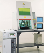 Ce laser Nd:YAG en mode pulsé de Unitek Miyachi comportant une puissance moyenne allant jusqu'à 500 watts, 10.0 kilowatts de puissance maximale, énergie d'impulsion de 70 Joules, cadence de répétition de 500 hertz est plus qu’assez puissant pour nous permettre de sceller étroitement les boîtiers en titane par le soudage par points rapide. Il y a 5 degrés de liberté (les axes XYZ plus deux mouvements angulaires pour le module dont émane le faisceau laser pour souder). La table XY mesure 18”x18” ; et le module Z a 10”. Le mouvement des échantillons est exécuté par des moteurs servo équipés d’encodeurs linéaires. On peut diviser l’énergie du faisceau laser pour alimenter 6 sorties de fibres optiques simultanément ou bien encore en temps partagé. Il y a un module de gaz de couverture inclus au cas où la soudure devrait être faite dans un environnement inerte. Avec ce système, on peut modifier la forme de l'impulsion laser et contrôler par feedback en temps réel la puissance générée par le laser. Un logiciel permet l’importation de divers fichiers CAD en 3D contrôlant le tracé à suivre sur l'échantillon pour souder celui-ci. Un échangeur de chaleur est fourni pour refroidir le laser.