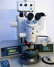 Avec ce manipulateur en 3D installé sur la station d’un zoom microscope de Leica, l'opérateur pourra positionner la seringue de l’éjecteur n'importe ou sur le flip-chip avec une précision de 25um dans la direction de l’axe X,Y ou Z. La distance de travail rotation du bouton fin de mouvement se traduit à 250um. Le manipulateur en 3D est monté sur un socle magnétique par une tige de 12mm de long. L'angle de la seringue relatif à l'horizontal peut être changé à l'aide d'un manipulateur pour mouvement brut en une dimension lui-même serré sur le manipulateur en 3D.